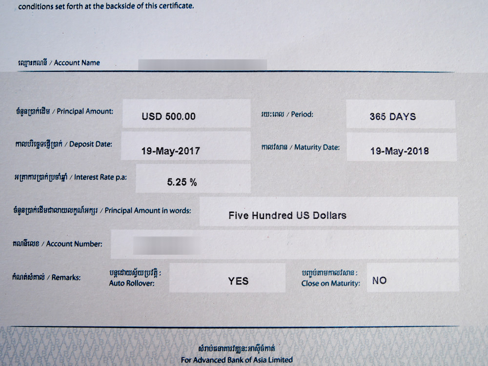 この時点で預金をするのですが、今回は1000ドル持ってきましたので、普通預金と定期預金1年に500ドルづつ預金したいことを伝えると、1年の米ドル定期預金の利率が年利5.25%で満期時に利息から14%が税で控除されるという説明を受けます。そして、定期預金の書類3枚にサインをして定期預金の預金証書が発行されます。