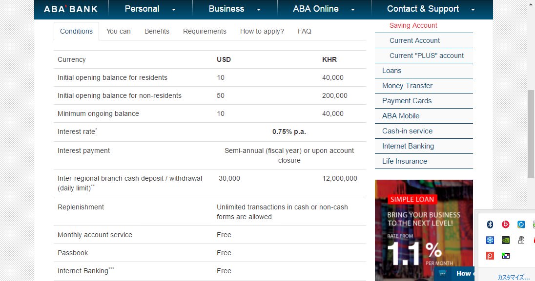 2017年現在、カンボジアでは、ようやくインターネットバンキング対応という銀行が増え始めて、ABA銀行はインターネットバンキング対応です。