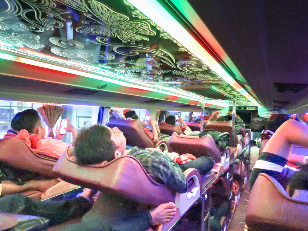 17:50、乗車開始です。ベトナム・ハノイ行き国際バスは寝台バスになります。ラオスナンバーのバスですがベトナムの寝台バスのように電飾が派手なのが特徴です。