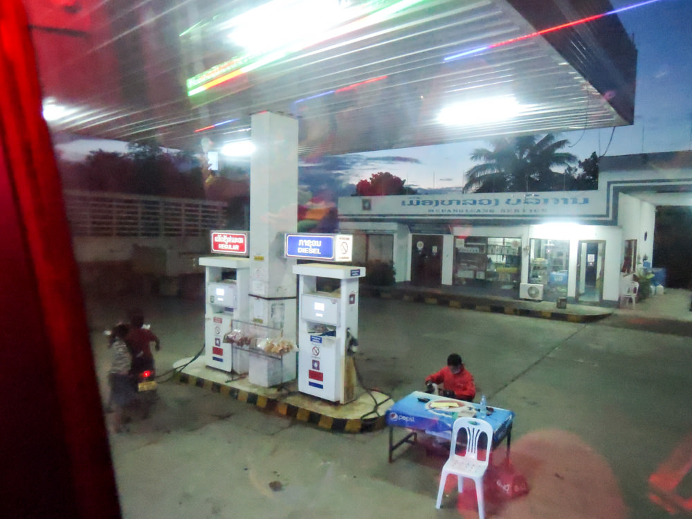 15分遅れでラオス・ルアンパバーンを出発しますが、1分も走らずにガソリンスタンドで給油です。日本だと事前に給油ですがラオスは乗客乗せたまま給油で日本とは勝手が違います。
