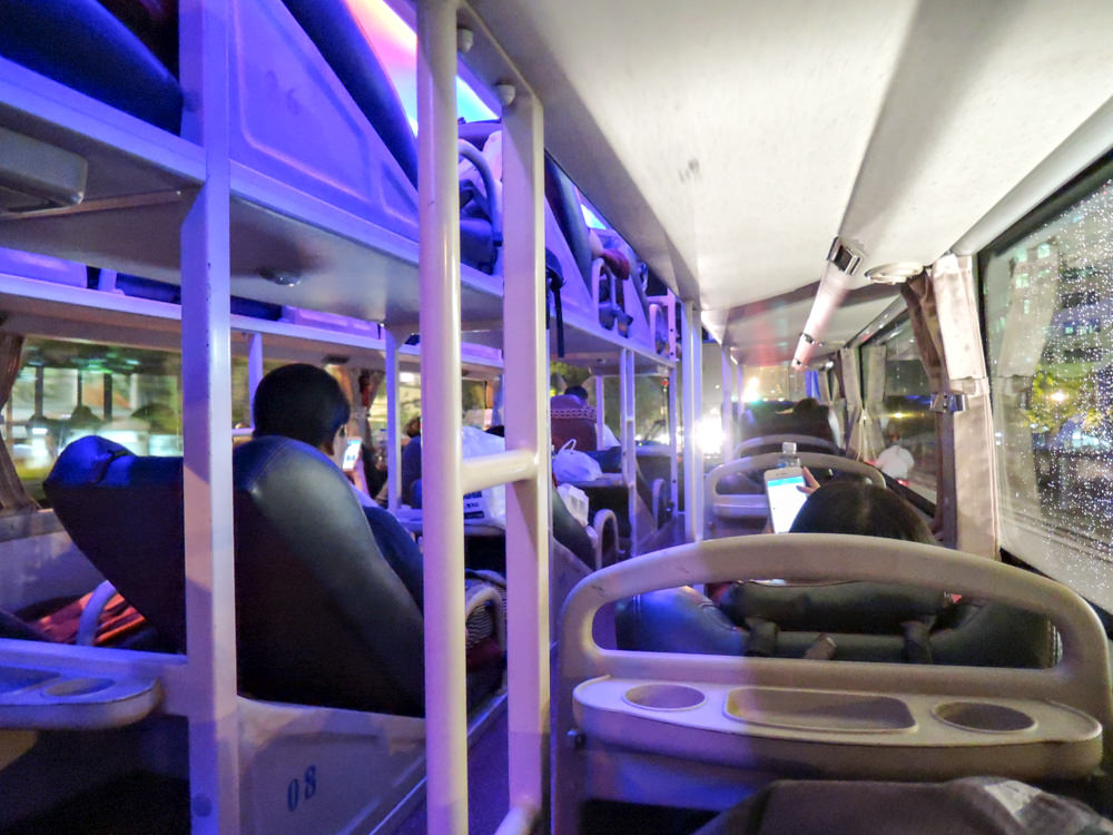 バスに乗車します。3列の2段ベッドで車内きれいなのですが、ベッドがかなり傷んでおり年季の入った寝台バスのようです。しっかり洗車したり手入れはしてありますが経年劣化には勝てないようです。