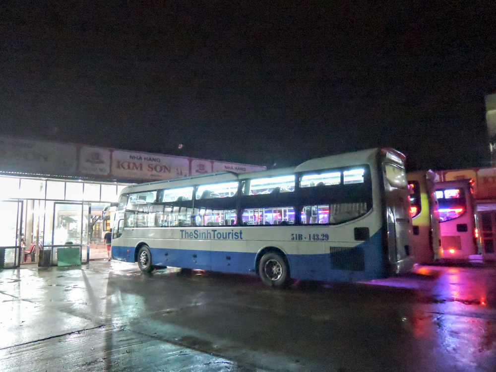 17:55、寝台バスがやってきました。トランクルームに大量の段ボール箱が積まれており、これは旅行会社だけでなく運送業もやっているようです。日本では規制の問題で高速バスがトラック輸送の代わりというのができませんから、ベトナムはかなり柔軟ですね。