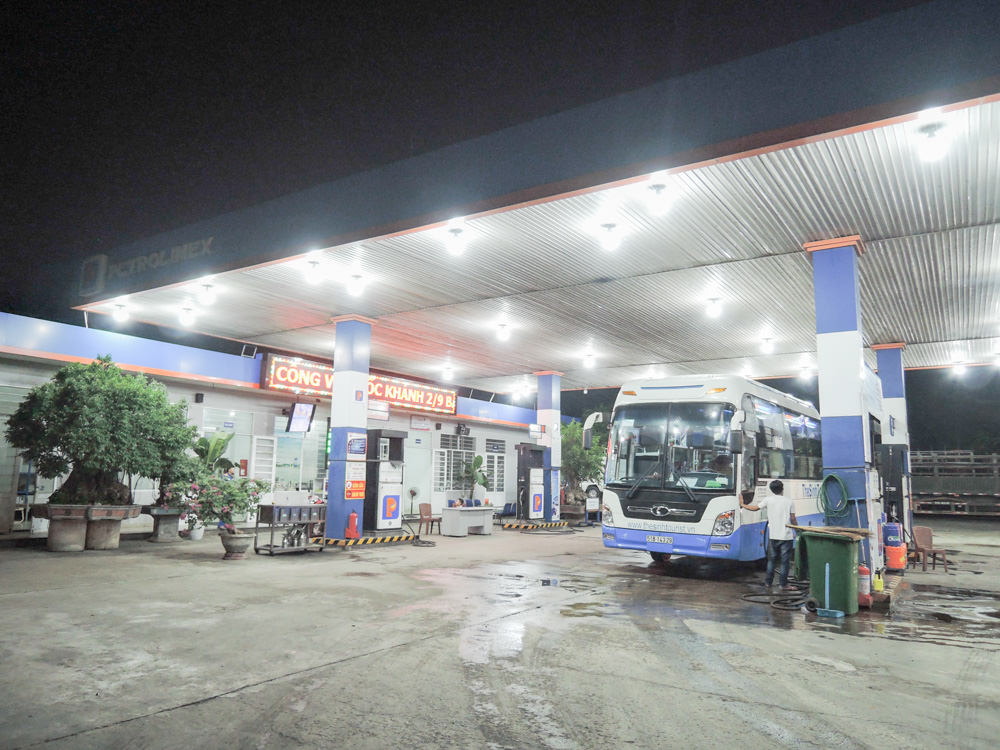 19:05、ガソリンスタンドで15分のトイレ休憩です。この間にバスは給油をしています。時間になり人数確認が行われ再びバスが出発します。