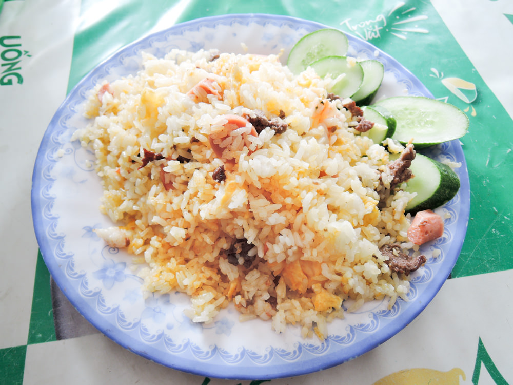 私も近くのレストランで昼食にベトナム版五目チャーハンともいえるコムチンタップカム40000ドン(200円)をいただきます。値段は50000ドン以下なので極端に高いというわけではなく比較的良心的です。